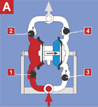 在圖中壓縮空氣由進(jìn)口進(jìn)入配氣閥,使膜片向右運(yùn)動(dòng),則A室吸力使介質(zhì)由C入口流入,推開球閥2進(jìn)入A室,球閥4則因吸入閉鎖,B室中的介質(zhì)則被擠壓,推開球閥3由D流出同時(shí)使1閉鎖,防止回流,就這樣循環(huán)往復(fù)使介質(zhì)不斷從C入口吸入D出口出排出。