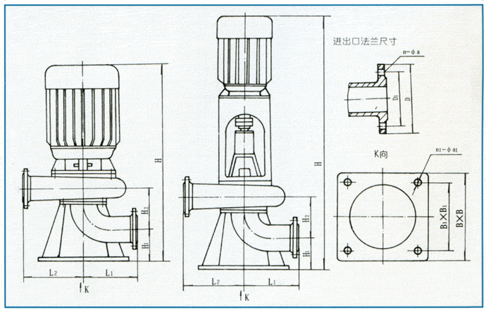 該系列泵具有兩種結(jié)構(gòu)形式,一是電機與泵直接同軸,二是采用聯(lián)軸器聯(lián)接,電機采用標準立式電機。其結(jié)構(gòu)圖如下,每種結(jié)構(gòu)形式具有兩種底座連接形式,一是進口水平吸入,具有轉(zhuǎn)角功能,可根據(jù)使用要求,進出口安放成0°、90°、180°、270°,便于管路連接,二是進口軸向吸入,便于立式安裝。