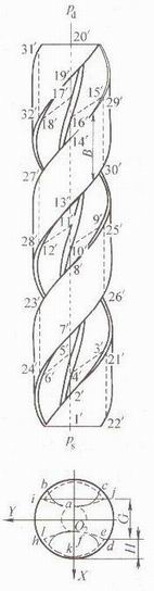 類密封性是指共軛的螺桿螺旋型面的嚙合線在螺桿螺旋橫截面上的投影嚙合線連續(xù),在理論上嚙合線能將相鄰的螺旋槽有效地隔開。這是排出腔和吸入腔完全隔開的必要條件。類密封性也就是在本章第二節(jié)中提到的對螺桿螺旋齒形曲線的要求。不銹鋼三螺桿泵理論螺旋型面的嚙合線形狀如圖3-3所示。采用擺線齒形曲線就是為了得到圓弧形的嚙合線。這在本章第二節(jié)已論證過,在理論上是安全符合類密封性的要求。從圖3-13繪制的螺桿螺旋嚙合的密封線可以看出:互相嚙合的螺桿螺旋接觸線能將螺旋槽隔成互不相同的兩部分。從動螺桿的螺旋棱邊6-7和8-9;和主動螺桿螺旋型面上的6-7和8-9相接觸,從動螺桿螺旋型面齒頂圓表面的接觸線7-8和主動螺桿螺旋型面齒根圓表面7-8相接觸,這樣就使主動螺桿的螺旋槽以接觸線5-6-7-8-9和從動螺桿上的6-7-8-9-10分隔成互不相通的兩部分空間。這些接觸線即為螺桿螺旋嚙合的密封線,它們在螺桿螺旋面上都是連續(xù)的,而且每隔半個導程(即一個螺距)重復出現(xiàn)。因此,在理論上螺桿螺旋互相嚙合時,這些密封線能將螺旋槽分割成互不相通,即互相密封的兩部分。擺線齒型嚙合的密封線在橫截面上的投影為圓弧形,故完全符合類密封性的要求。