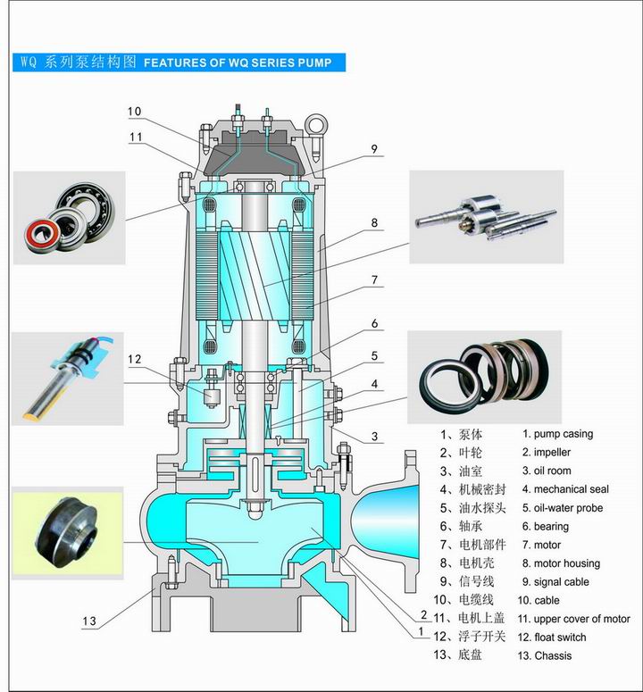 WQP系列不銹鋼潛水排污泵由電機(jī)與泵兩部分組成,二者通過油隔離室及機(jī)械密封組件隔開,屬機(jī)電一體化產(chǎn)品,電機(jī)與泵合用同一軸(轉(zhuǎn)子)整個水泵長度短,結(jié)構(gòu)緊湊。配備多種保護(hù)裝置,使得泵運行可靠,其主部件作用如下: