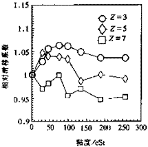圖4表示不同葉片數(shù)條件下,滑移系數(shù)隨粘度的變化關(guān)系曲線。由圖可見,滑移系數(shù)隨粘度的變化關(guān)系曲線取決于葉片數(shù)。當(dāng)葉片數(shù)較少(Z=3)時(shí),滑移系數(shù)隨粘度增大而增加,直到粘度大于75cSt以后,略有減小,但都比輸送清水時(shí)的大。當(dāng)葉片數(shù)中等(Z=5)時(shí),當(dāng)粘度在20~100cSt范圍內(nèi),滑移系數(shù)達(dá)到值,以后隨粘度增大而減小,接近輸送清水時(shí)的滑移系數(shù)值。當(dāng)葉片數(shù)較多(Z=7)時(shí),滑移系數(shù)隨粘度增大而減小,比輸送清水時(shí)的小。圖5表示不同葉片數(shù)時(shí)相對滑移系數(shù)隨粘度的變化關(guān)系。相對滑移系數(shù)是指輸送粘油時(shí)的滑移系數(shù)與輸送清水時(shí)的滑移系數(shù)之比。該圖反映的變化規(guī)律與圖4完全一致。