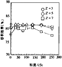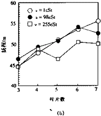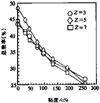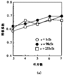2.3 水力效率 圖6表示不同葉片數(shù)條件下水力效率隨粘度的變化關(guān)系。當(dāng)粘度低于200cSt時(shí),Z=5葉輪水力效率比其它葉輪高;當(dāng)粘度高于200cSt時(shí),Z=3葉輪比其它葉輪高。這種變化趨勢與泵總效率隨粘度的變化情況很一致,見圖9。