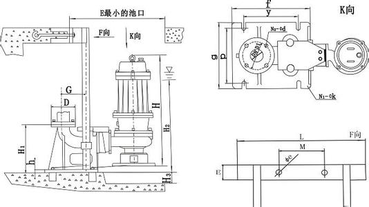 潛水電泵出水法蘭與出水管路系統(tǒng)自動對接的自動耦合裝置,由潛水電泵出水法蘭、附加耦合法蘭和出水管座進口法蘭組成,在附加耦合法蘭和出水管座進口法蘭的兩側(cè)各有一對楔卡且楔點的位置在法蘭的水平中心線附近。當潛水電泵從水坑上方降落時,附加耦合法蘭兩側(cè)的楔卡和出水管座進口法蘭兩側(cè)的楔卡就卡到一起,在潛水電泵自重和楔卡斜面的作用下,兩個法蘭面緊緊地貼在一起,就好比兩個法蘭的兩側(cè)用兩個螺栓上緊了一樣,潛水電泵的水壓再大也不能推開法蘭面而大量漏水。當潛水電泵從水坑內(nèi)往上提起來時,兩對楔卡能夠沿斜面方便的脫開,從而實現(xiàn)自動耦合裝置的功能。它可以在方便潛水電泵自動裝拆的同時,解決耦合的兩個法蘭之間大量漏水的問題,從而節(jié)約能源。 (2)自動耦合式潛污泵的安裝方式 自動耦合式潛污泵安裝主要是耦合裝置的安裝和泵的吊裝。安裝前在泵吊環(huán)上系上鏈鎖,供起吊與下泵之用。 耦合裝置的安裝步驟:偶合架用四個螺栓固定于泵體;出水管固定于基底;定位錐體安裝于出水管座;導管下端套在定位錐體上,上端套在導桿架的橡膠塊上;*后將導桿架固定于水池壁。橡膠塊的作用:用導桿架上的螺釘調(diào)節(jié)橡膠塊的軸向壓緊程度,使橡膠塊的直徑與導桿內(nèi)徑相吻合,讓導桿穩(wěn)定。 泵的安裝步驟:起吊水泵,將耦合架上的導向孔對準導桿,徐徐放下吊索,使泵沿導桿自由下滑,泵體出口與出水管座口即自動對準;松開吊索,在泵的自重作用下,使耦合架上的斜面與出水管座上相對應的斜面楔緊,泵體法蘭面與出水管座密封面即可緊密貼合,這樣就實現(xiàn)了泵和出水管座的自動耦合。需要起吊時,只需拉起吊索,使泵和耦合架與出水管脫開,將泵與耦合架沿導桿拉起即可。