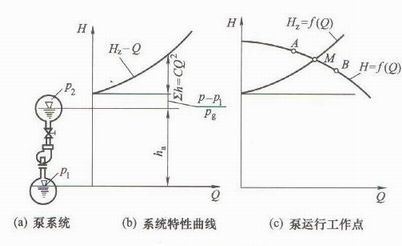 把泵特性曲線Η=f(Q)與系統(tǒng)特性曲線Ηz=f(Q)畫在同一張圖上,泵特性曲線與系統(tǒng)特性曲線的交點M就是泵運行時的工作點,如圖2-97(c)所示,在該點單位重量液體通過泵增加的能量(泵揚程H )正好等于把單位重量液體從吸水池送到排水池液面需要的能量(即系統(tǒng)揚程Hz),故m點是泵穩(wěn)定的運行點。如果泵偏離M點在A點工作。這時H>Hz,多余的能量促使管內(nèi)流速增加,泵的流量增加,工作點從A移向M 點。反之,如泵在 B點工作,這時H<Hz,管內(nèi)流速減慢,泵流量減小,從B點移向M點。*后都要回到M點穩(wěn)定下來,故泵的穩(wěn)定點一定是泵特性曲線的交點。但是對有駝峰附近時,一旦偏離,將回不到M點。因此一般不允許采用有駝峰性能曲線的泵。