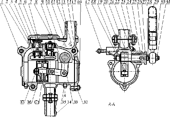 S、SH-25、38型手搖泵的結(jié)構(gòu)原理是,當(dāng)用手往復(fù)搖動搖手柄(29)時,通過軸(21)、搖臂(9)、連桿(36)等傳動機(jī)構(gòu),使活塞(7)作往復(fù)運動。如圖所示,當(dāng)活塞向左移動時,右端的泵缸體積逐漸擴(kuò)大,形成真空,液體從吸水管(34)經(jīng)過鑄在泵體旁邊的吸入流道頂開吸水閥進(jìn)入缸體右端。在同一時間里,缸體左側(cè)由于活塞的壓縮,使壓水閥(5)頂開,液體經(jīng)吐出管(11)排出。若活塞的運動方向返回向右時,則泵缸左側(cè)吸入液體,泵缸右側(cè)排出液體,這樣往復(fù)不歇地把液體吸入排出。形成泵的工作。泵的壓水閥向上行程由蓋板(6)限止,吸水閥向上行程由壓水閥限止。蓋板與泵體用螺栓(8)緊固,活塞行程由泵蓋(14)和泵體限止。